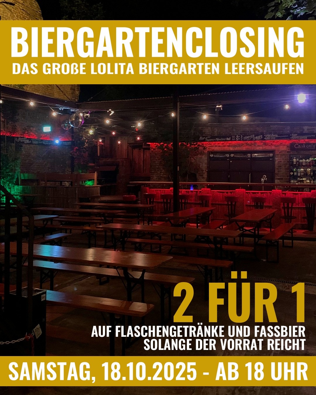 Am SAMSTAG, den 18. Oktober AB 18 UHR laden wir euch ein zum großen Lolita Biergarten Closing - das traditionelle Leersaufen zum Saisonende 🤩