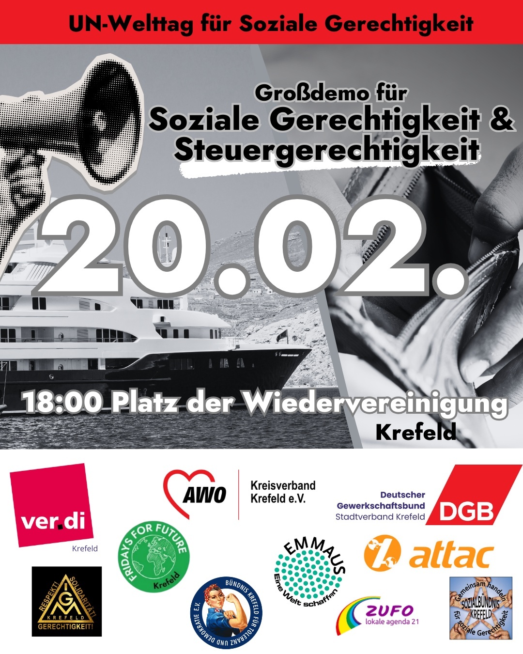 Am internationalen Tag für Soziale Gerechtigkeit ruft ein breites Krefelder Bündnis dazu auf, endlich für Steuergerechtigkeit auf die Straße zu gehen.