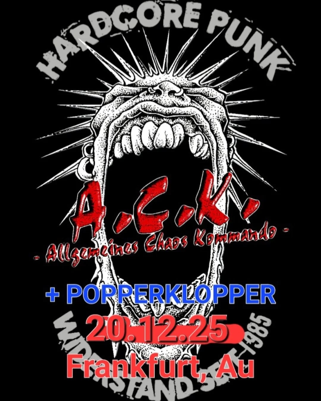 POPPERKLOPPER sind seit über 25 Jahren fester Bestandteil der Deutschen Punk-Rock Szene. Klassischer Deutschpunk mit melodischem 70er Jahre Punkrock und abwechselnden deutschen und englischen Texten, während A.C.K., was für Allgemeines Chaos Kommando steht, ruppigen Deutsch-Punk mit Old-School-Hardcore-Schlagseite spielen. Leider hört Bassist Oli, eins der letzten Gründungsmitglieder, auf und spielt heute noch ein letztes Mal.