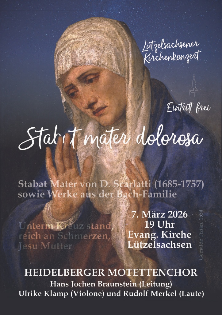 Herzliche Einladung zum Lützelsachsener Kirchenkonzert am 7. März um 19 Uhr mit dem Heidelberger Motettenchor unter der Leitung von Hans Jochen Braunstein mit Ulrike Klamp an der Violone und Rudolf Merkel an der Laute. Im Zentrum des Abends in der Evang. Kirche Lützelsachsen (Weinheimer Straße 13) steht das "stabat mater dolorosa" von Domenico Scarlatti und Werke der Bach-Familie. Der Eintritt ist frei.