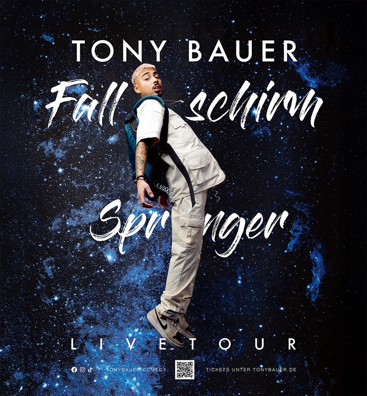 Mittlerweile ist er mit seinem ersten Soloprogramm „Fallschirmspringer“ unterwegs. Mit Witz, Charme und dem Blick auf die Welt, durch seine eigene „Duisburg-Marxloh-Brille“, nimmt Tony Bauer das Publikum mit auf eine Reise durch seinen Alltag, seine Viertel, seine Hood. Erzählt von Hassan, Oma und Opa, dem Leben mit Kurzdarmsyndrom und dass er ein Leben nach dem Tod hat, und zwar ein sehr, sehr lustiges! Mit seiner Bühnenpräsenz und einer Geschichte, die inspiriert, lädt Tony Bauer alle Zuschauer dazu ein, mit ihm in seine Welt einzutauchen.