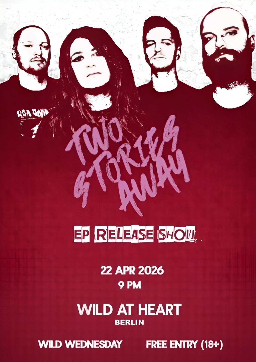 Two Stories Away is a pop-punk band based in Berlin, Germany. The band's sound is bringing elements from 2000s pop-punk combined with melodic choruses with an authentic, darker edge. TSA is exploring feelings of emotional pressure, falling apart and searching, but also hope and escapism, and a sense of movement, all delivered unapologetically with and from the heart. Their music is heavily inspired by bands such as Blink-182, Simple Plan, Box Car Racer and Paramore, bringing a sound that’s nostalgic and current at the same time. The band was formed in the summer of 2025 and their debut EP “Breaking the Rules with a Smile On” will be released on the 22nd of April. Two Stories Away are Ella Lappalainen (vocals), Yury Gargay (bass), Marco Boock (guitar) and Marius Beljanski (drums)